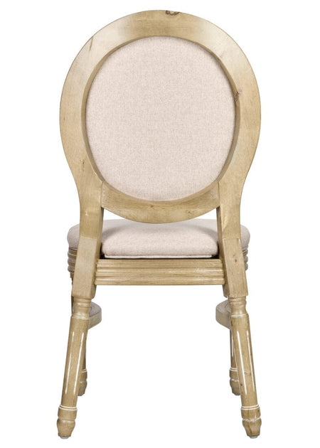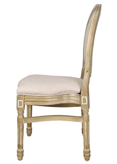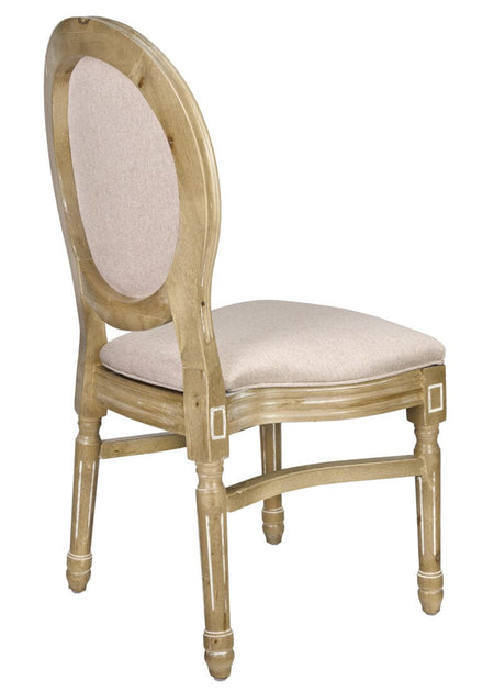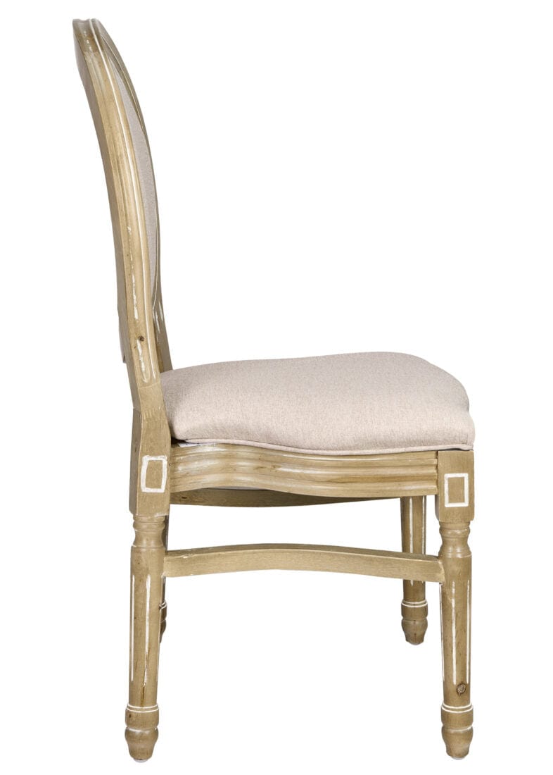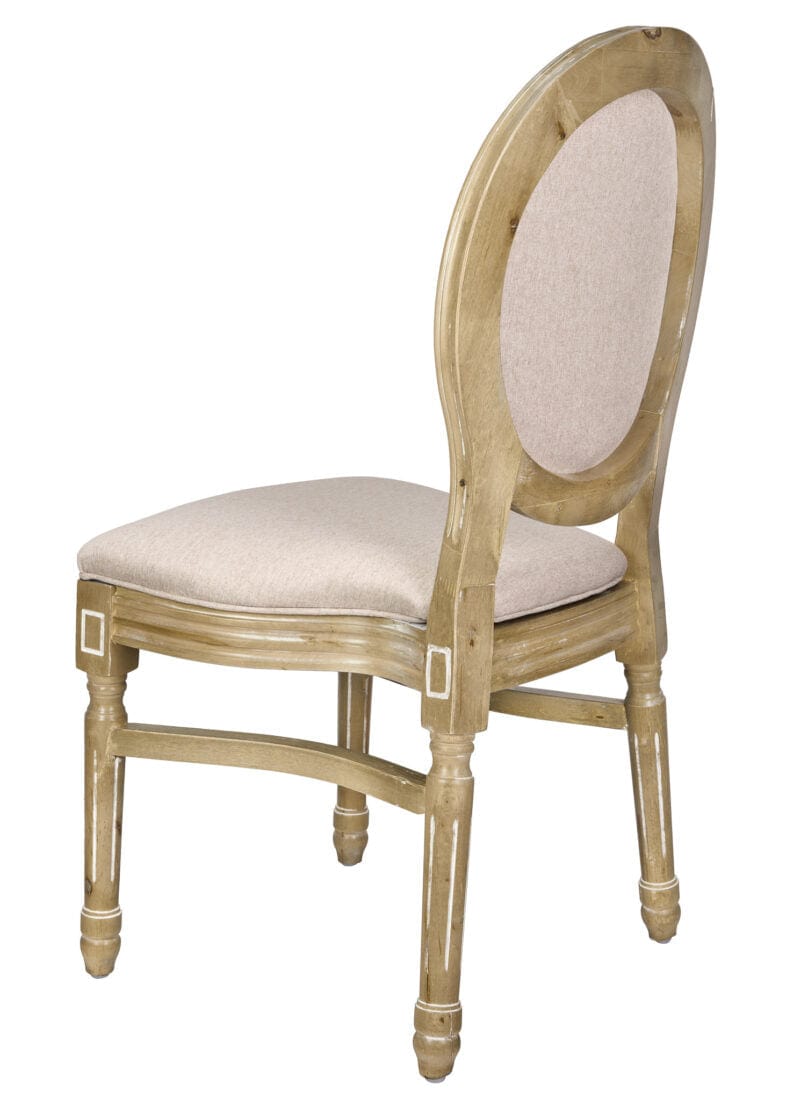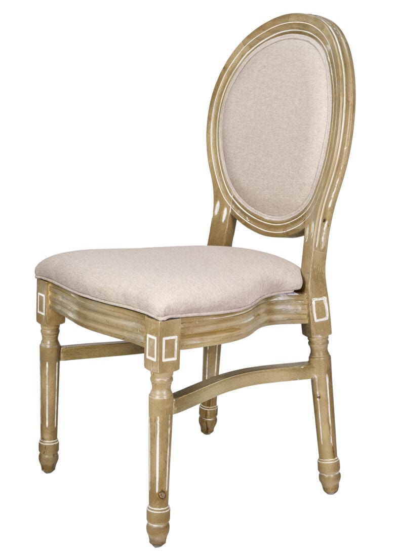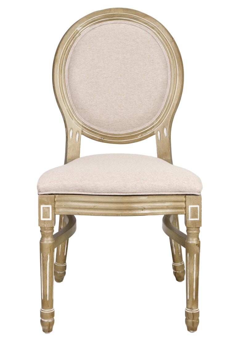 For a cohesive antique aesthetic, the Antique Distressed Wood Louis Pop Chair with Beige Tweed Seat and Back delivers complete texture and comfort. Popular for high-end rustic venues, it complements wood tables and vintage decor seamlessly.