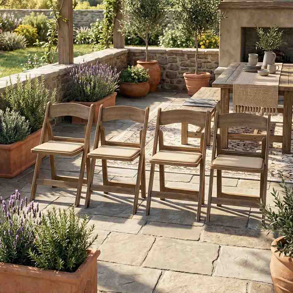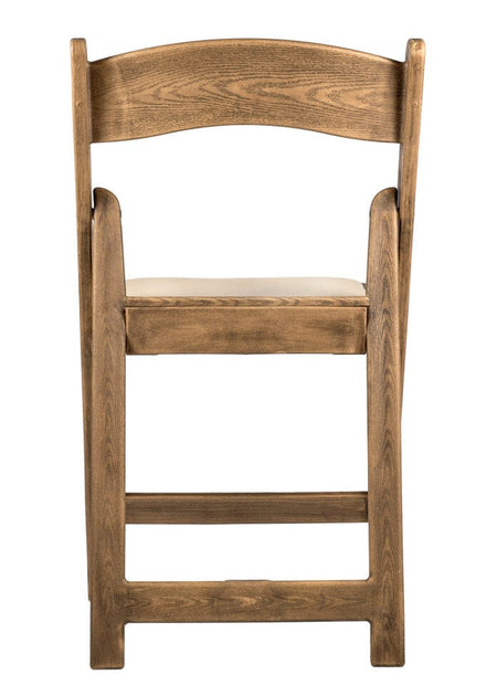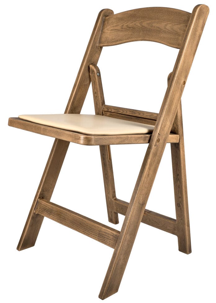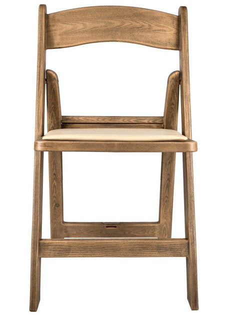 This chair blends the look of natural wood with the strength of resin and Steel Skeleton™ support. A tan seat provides comfort, while its folding design makes it practical for kitchens, patios, or multipurpose home seating.