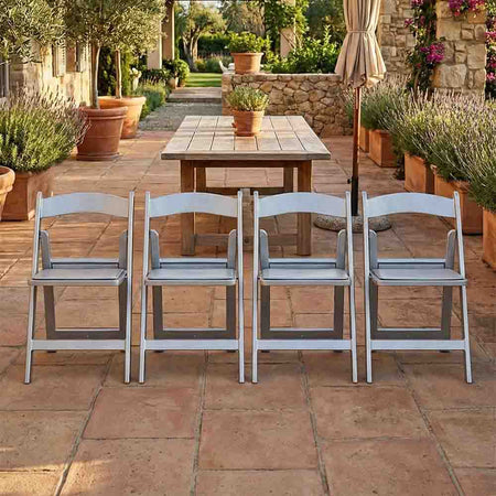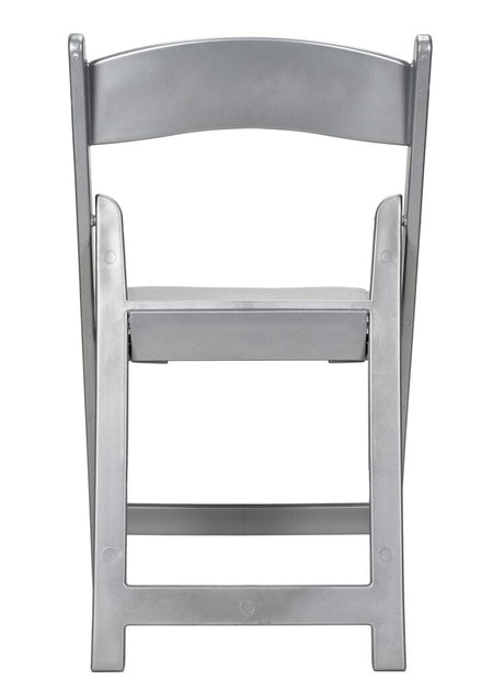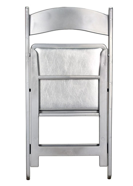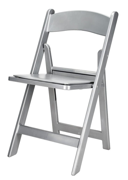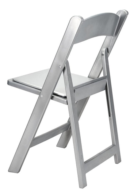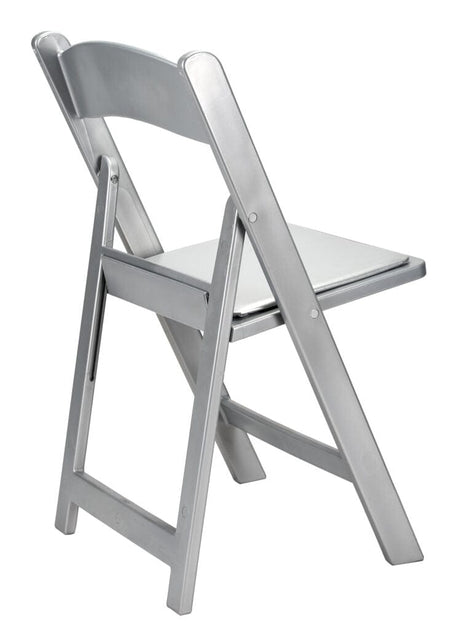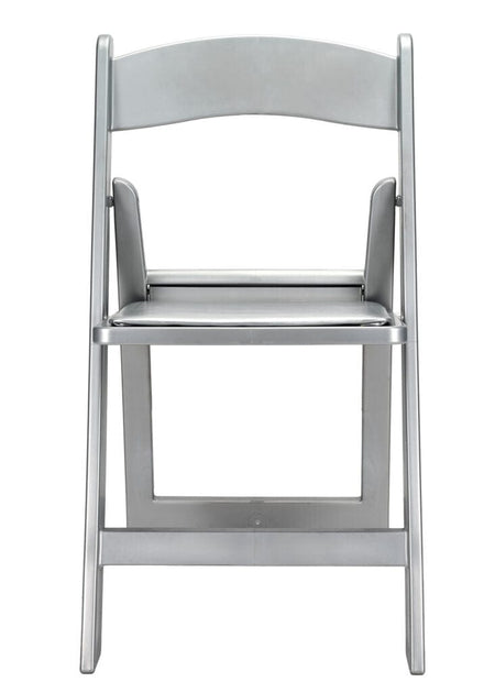 Reinforced with Steel Skeleton™ strength, this folding chair features a silver resin frame and a padded silver cushion. Lightweight and stylish, it's perfect for modern kitchens, porches, or multipurpose rooms that need extra seating.