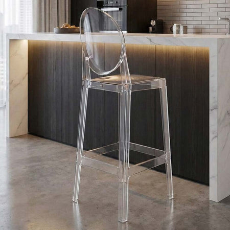 Elevate modern interiors with this clear ghost-style barstool featuring an oval back. Seamlessly fits into contemporary kitchen islands or stylish vanity setups with ease.