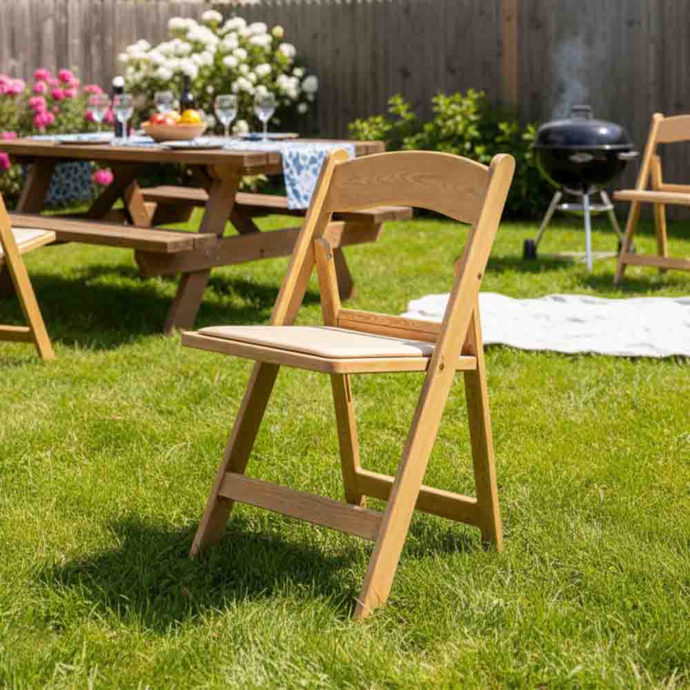 Resin Woodgrain Folding Chair – Tan Padded Seat | Patio & Event Seating